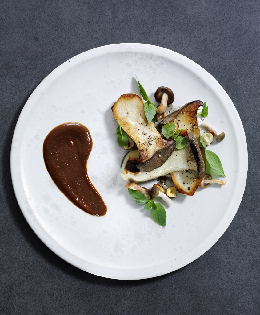 Hovedret: Marineret og stegt kejserhat med svampepuré, misosauce, syltede svampe og thaibasilikum.