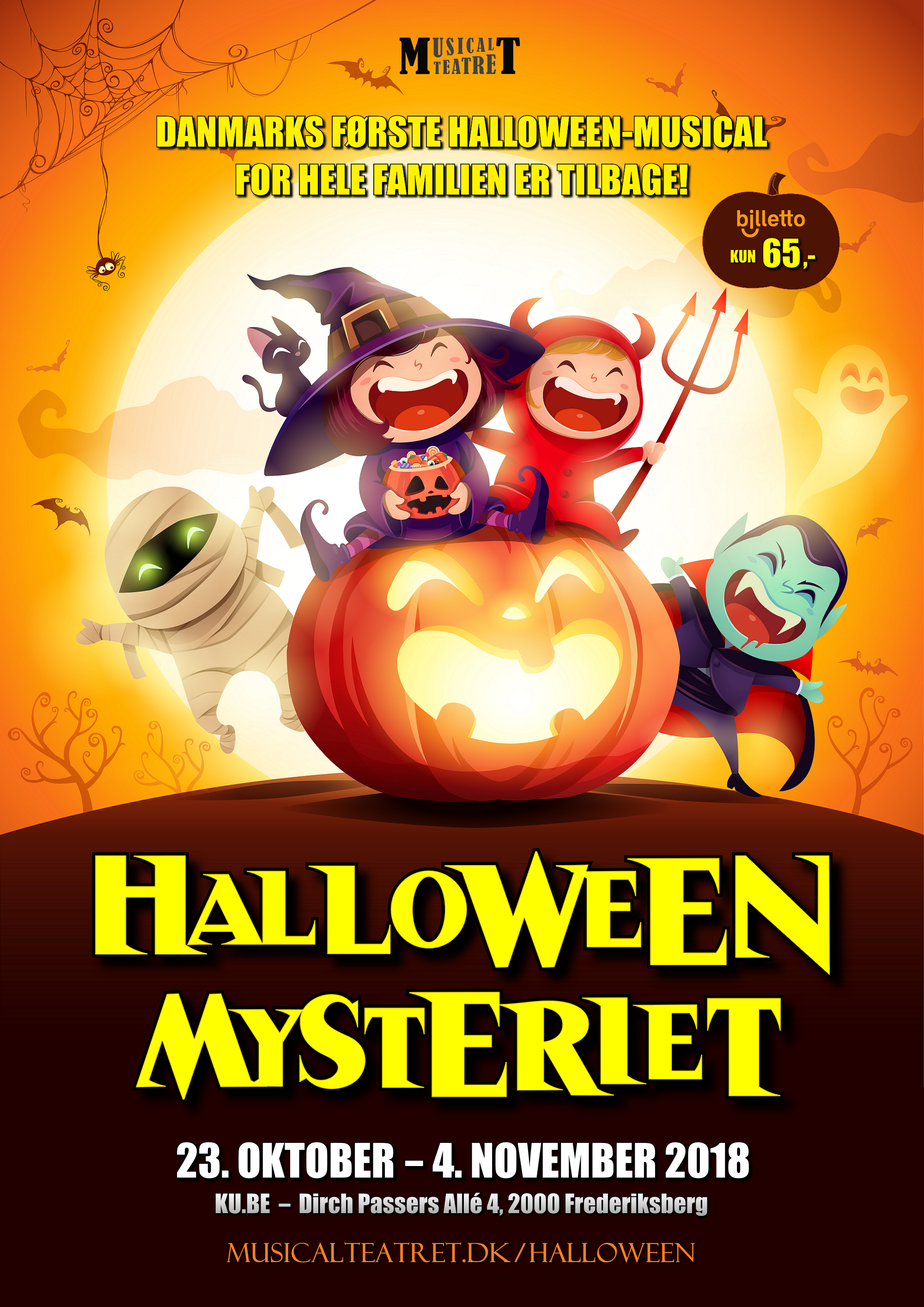 Glæd dig til Musicalteatrets genopsætning af Danmarks første halloween-musical “Halloween-mysteriet” – en hyggelig, underholdende og sjov teaterforestilling for hele familien (egnet for alle voksne og børn fra 3 år og op), som først blev sat op i 2015 og nu har repremiere i KU.BE på Frederiksberg d. 23. oktober - 4. november 2018. Forestillingen varer ca. 60 minutter og spiller hele 32 gange i spilleperioden.